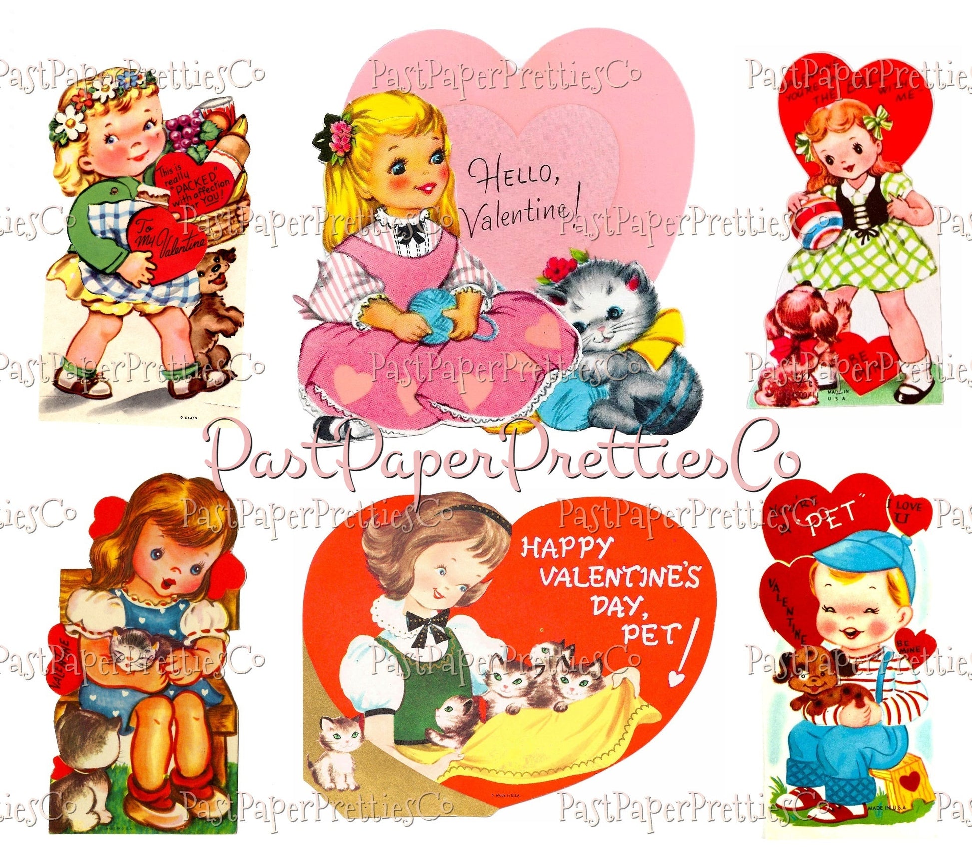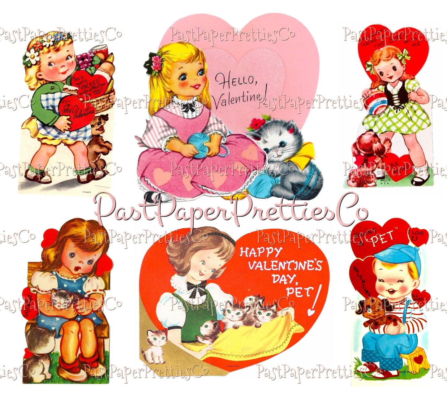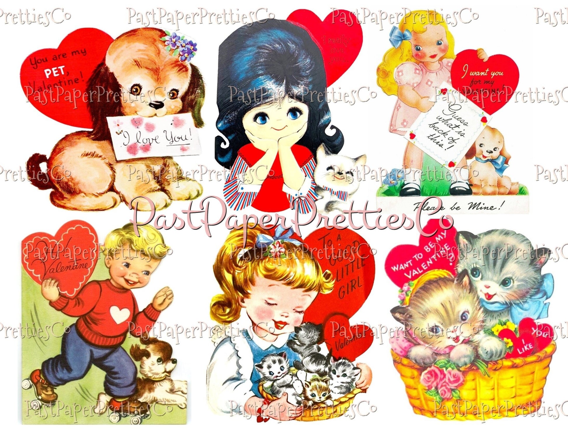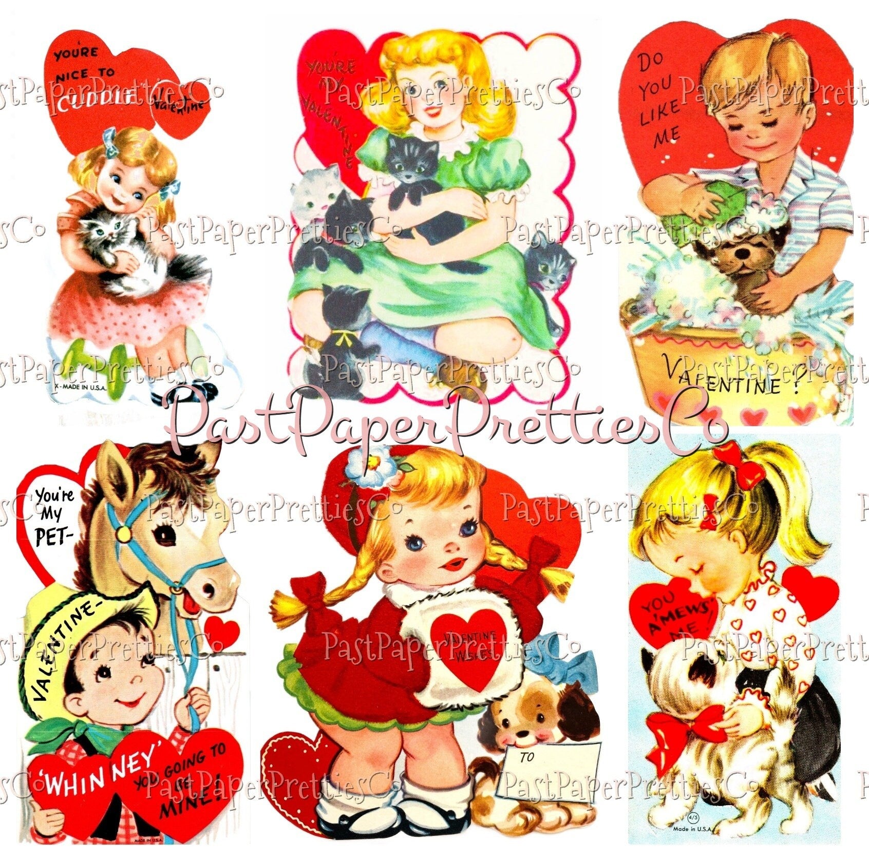 60 Vintage Printable Kids with Pets Valentine Cards Collage Sheets PDF Instant Digital Download Retro Boys Girls Animal Themed Images