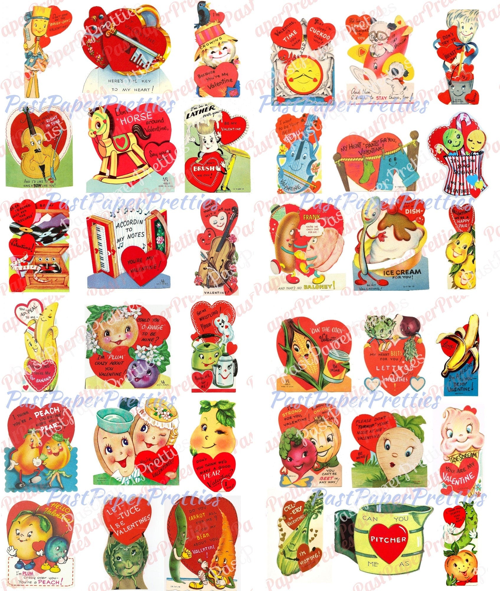 72 Vintage Kitsch Anthropomorphic Valentine Cards Images Fruit Veggies Items Objects Collage Sheets Printable PDF Instant Digital Download
