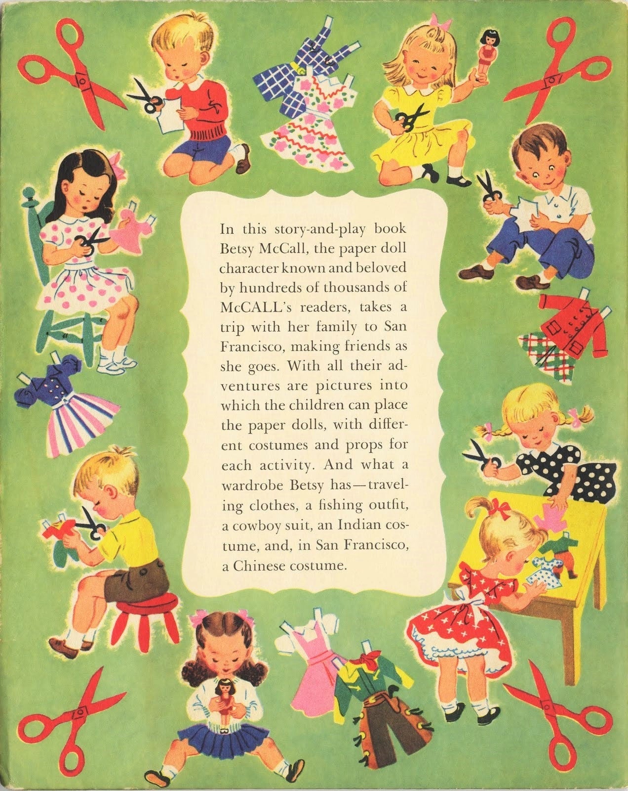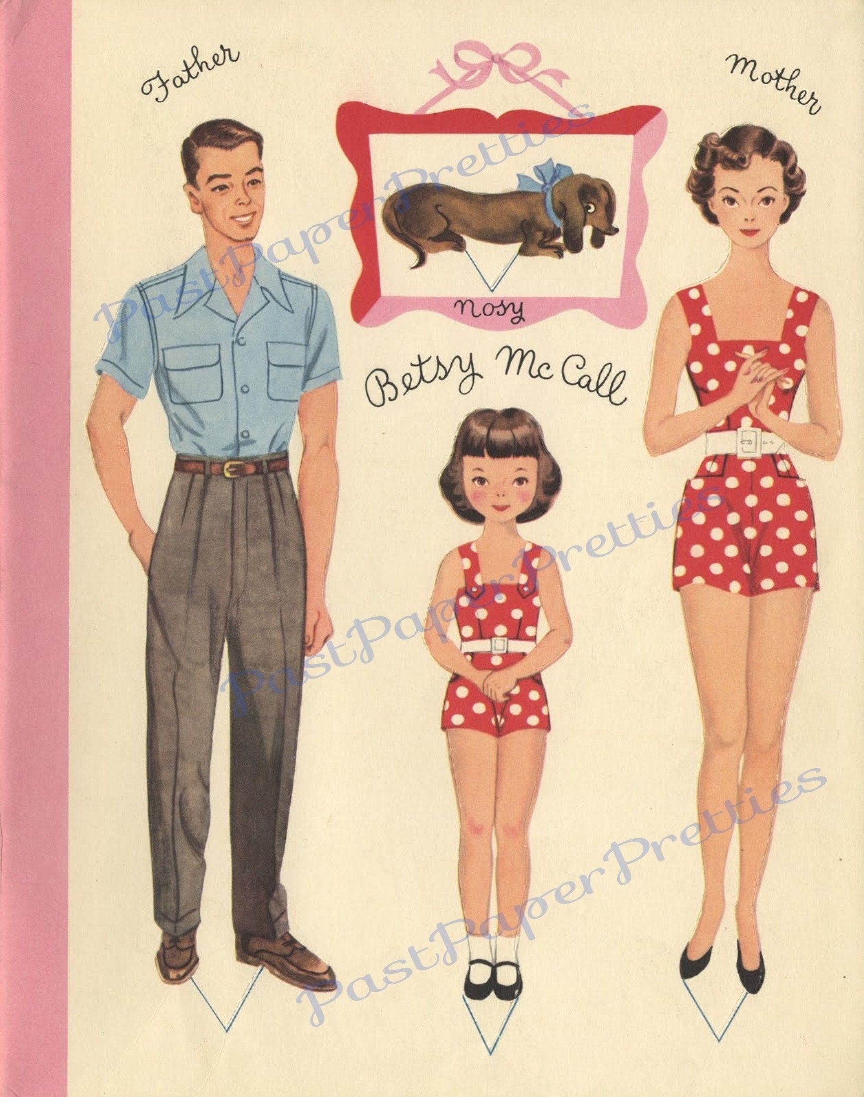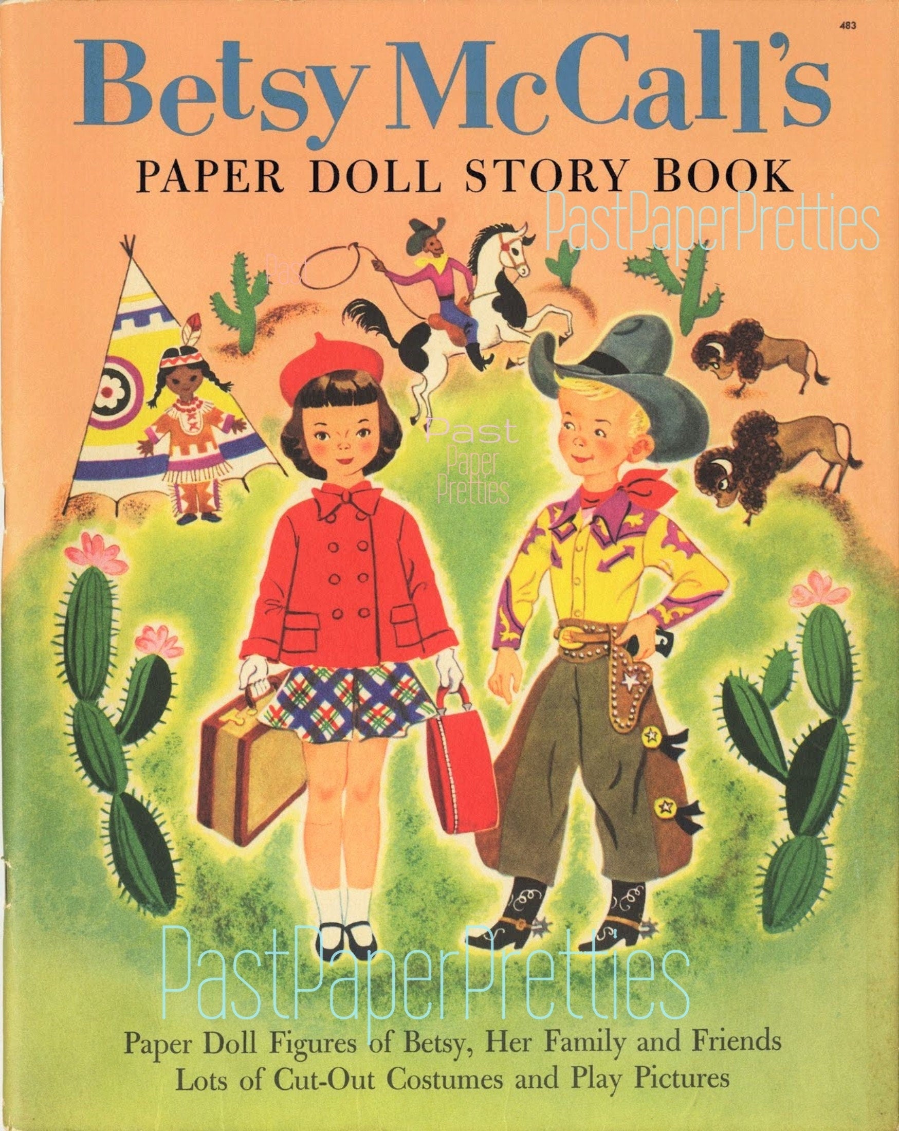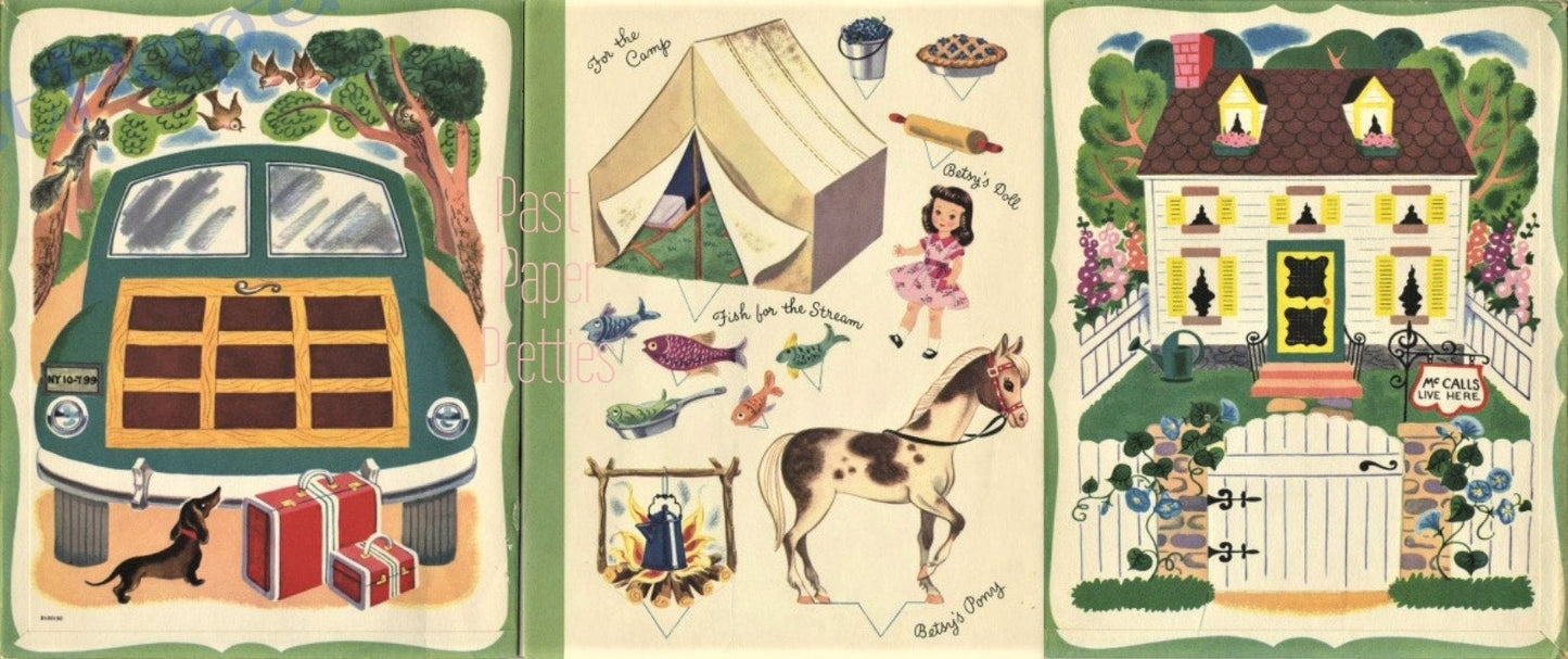 This original 1954 publication repro includes 40 pages of Betsy and her family paper dolls, clothing, accessories, scenery backdrops and 4 fun stories to read with plenty of colorful illustrations.