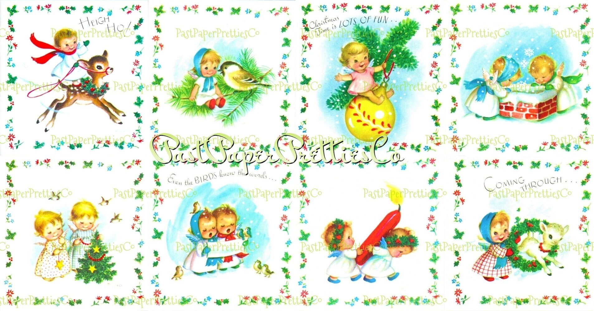 Eight adorable images featuring cute Angel children, framed in festive holly.