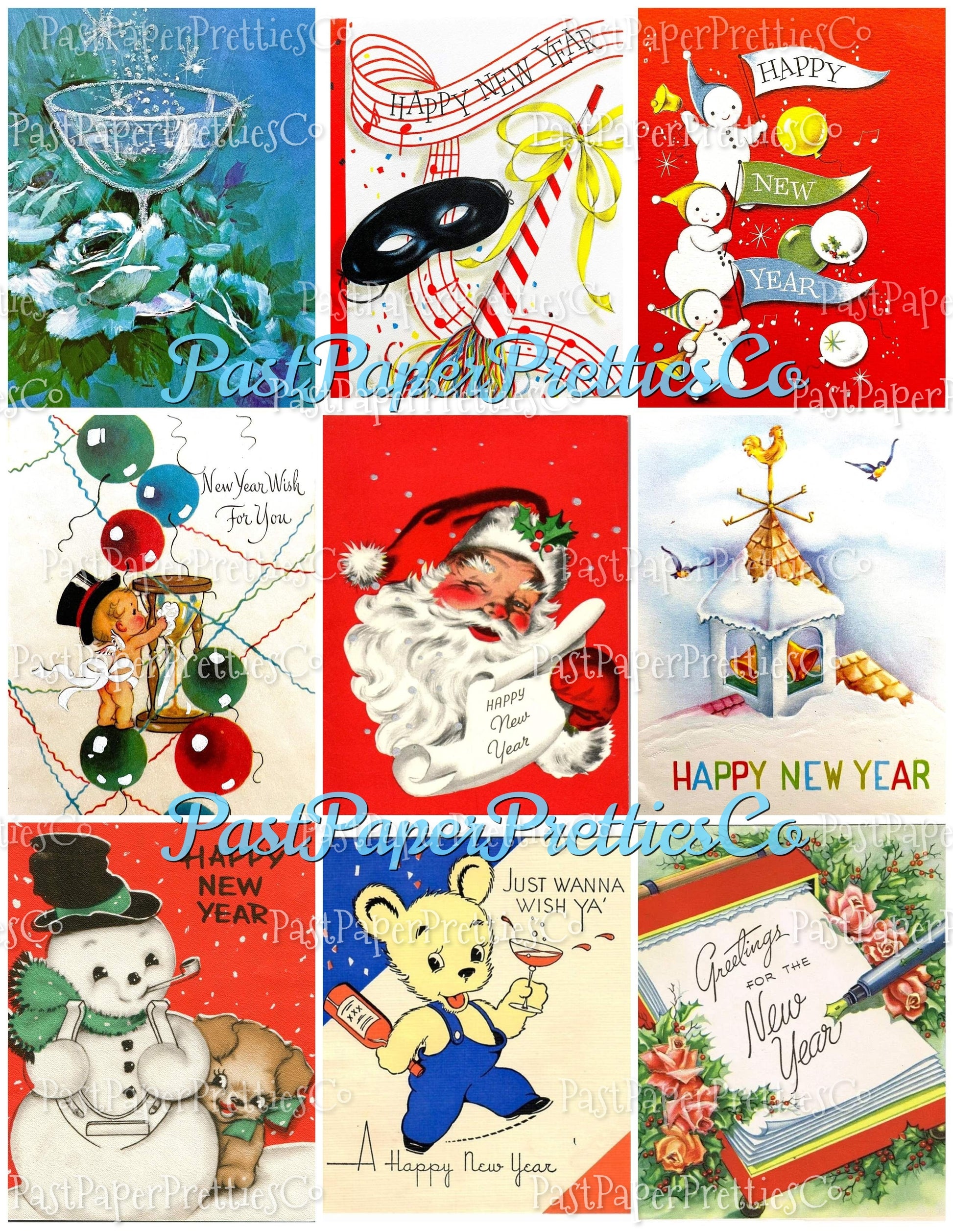 Vintage Happy New Year Printable MCM Card Collage Sheets PDF Instant Digital Download 63 New Years Day Eve Clipart Images