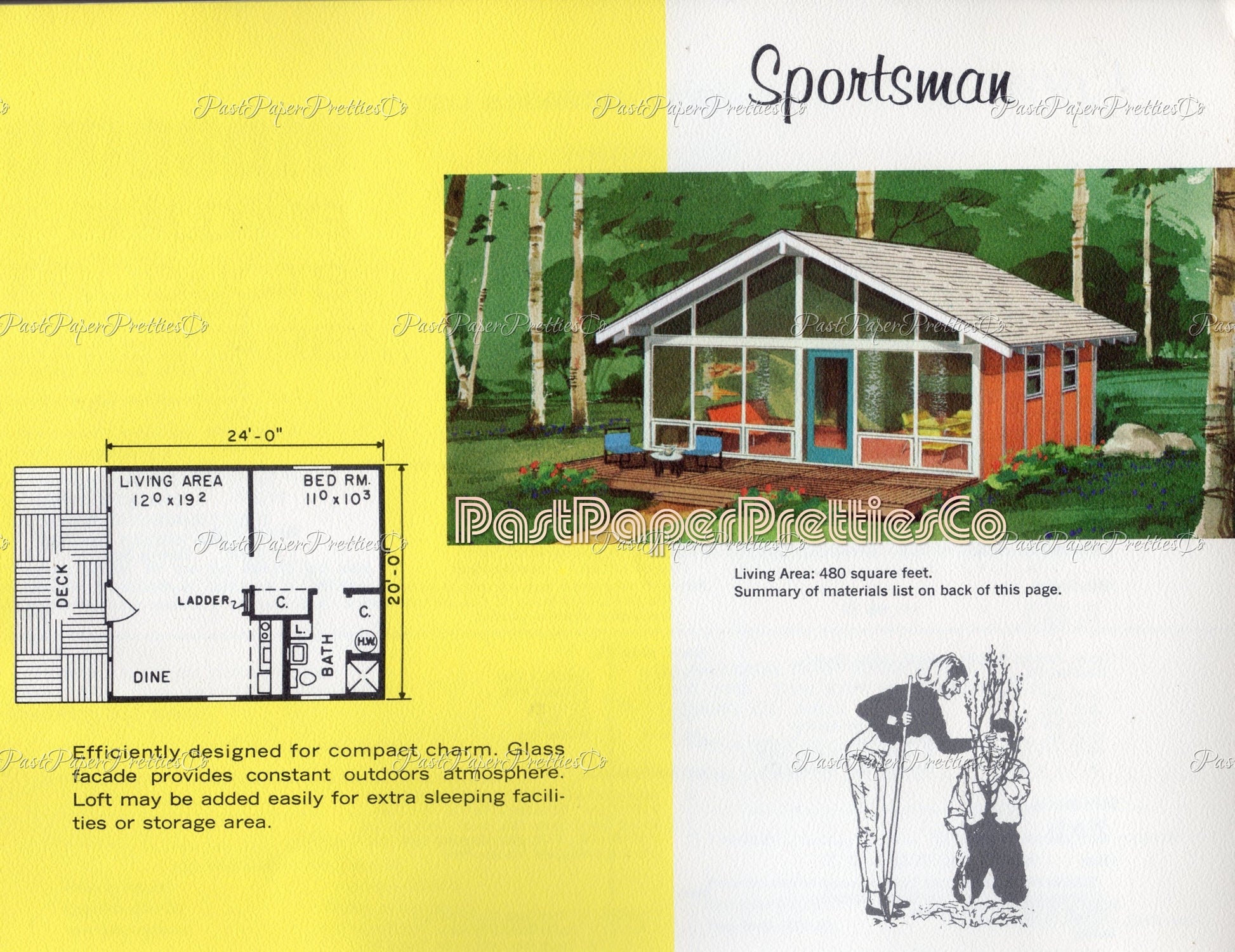 11 pages feature wonderfully illustrated cottage homes with their color illustration, blueprint floor plans, description and square footage. A-Frames, low line bungalows