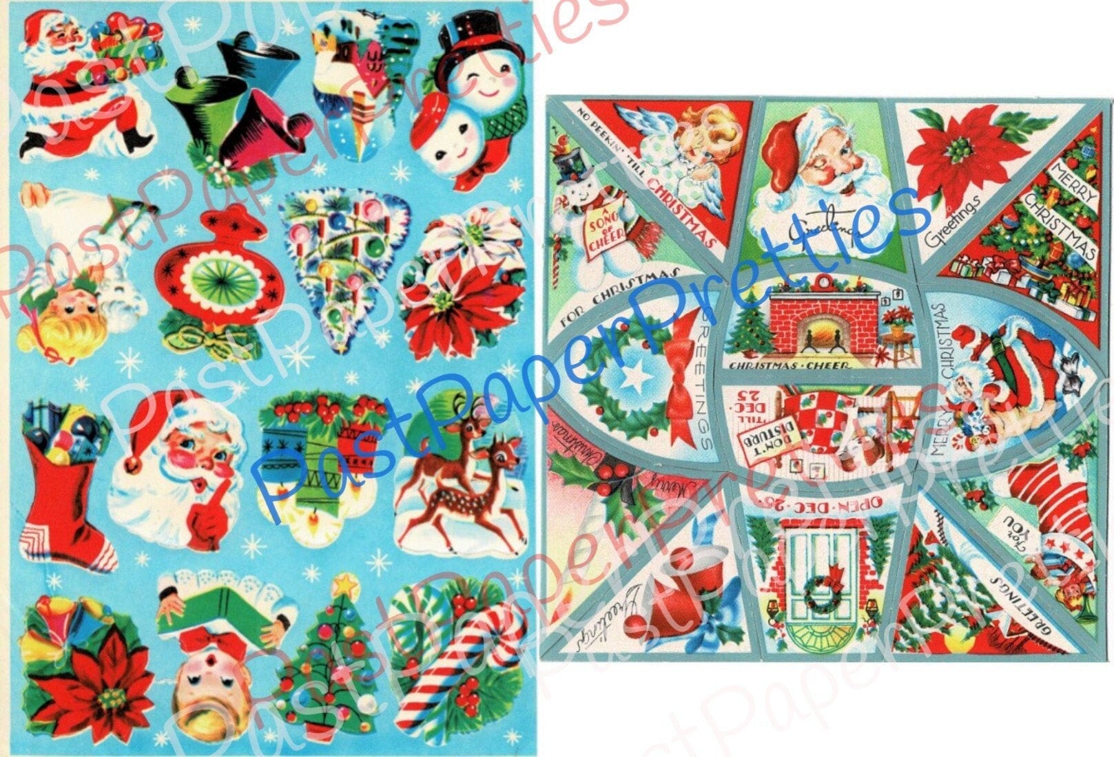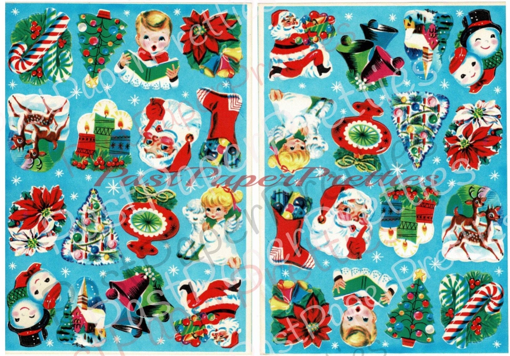 Offering a lot of two vintage instant digital printable Christmas gift tag/seals/sticker sheets in a nice assortment of cute, festive designs - very mid-century Kitsch!