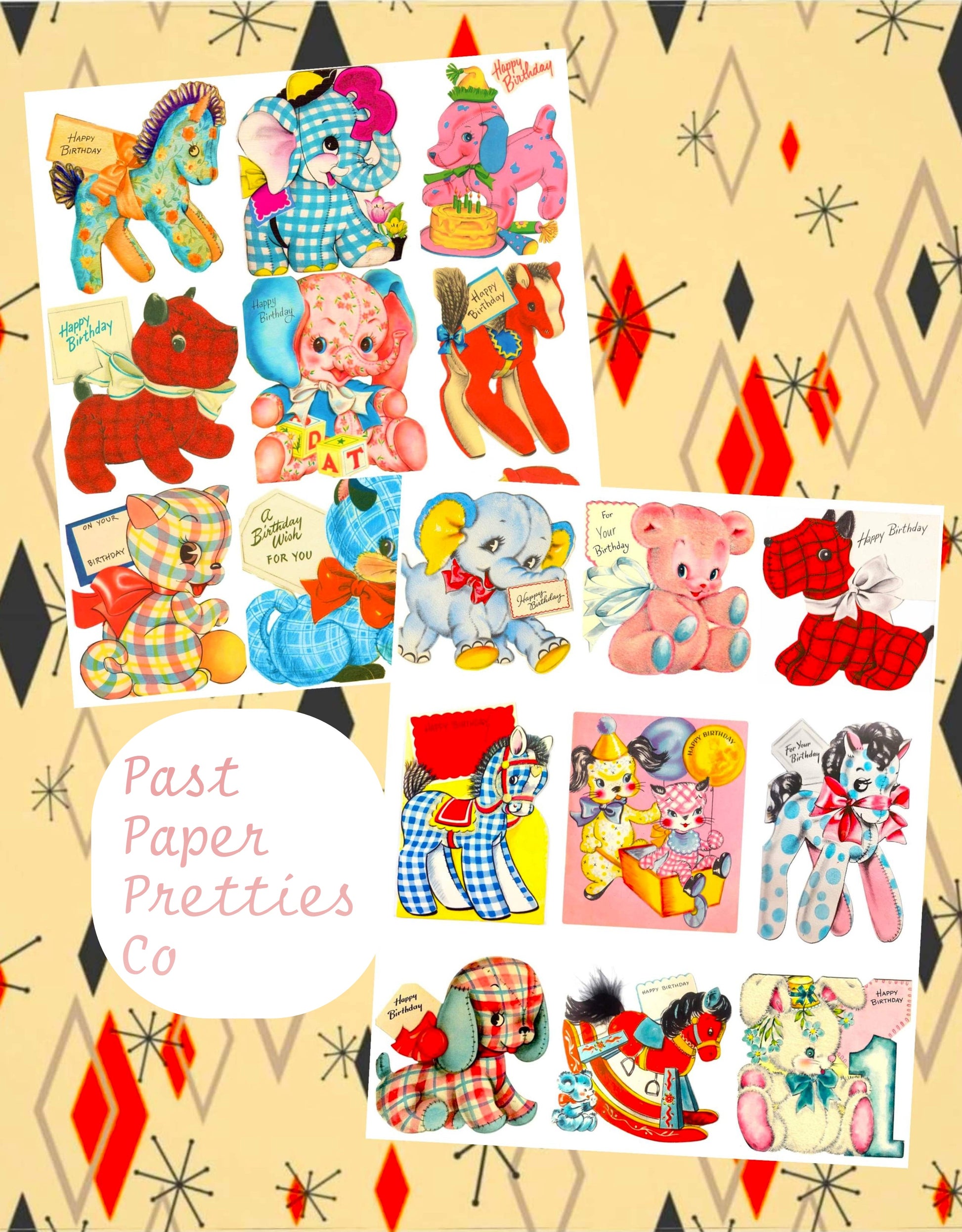 Vintage Printable Happy Birthday Soft Toy Stuffed Animals Greeting Cards Retro Collage & 18 Single Images PDF Instant Digital Download