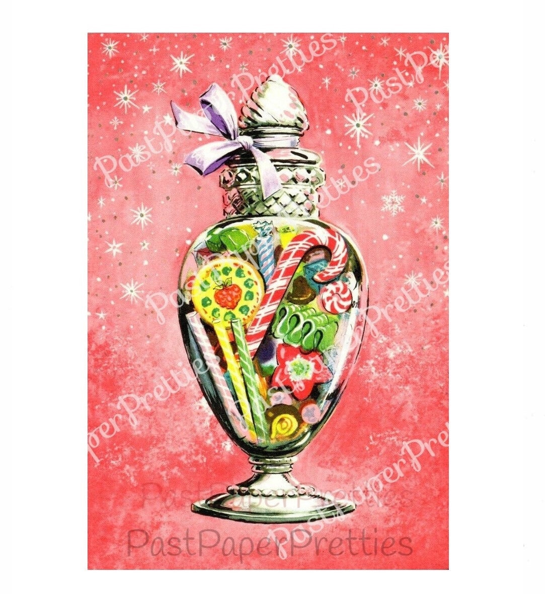 Offering a vintage printable digital Christmas image featuring a delightful old fashioned decanted candy jar, filled with Holiday goodies!
