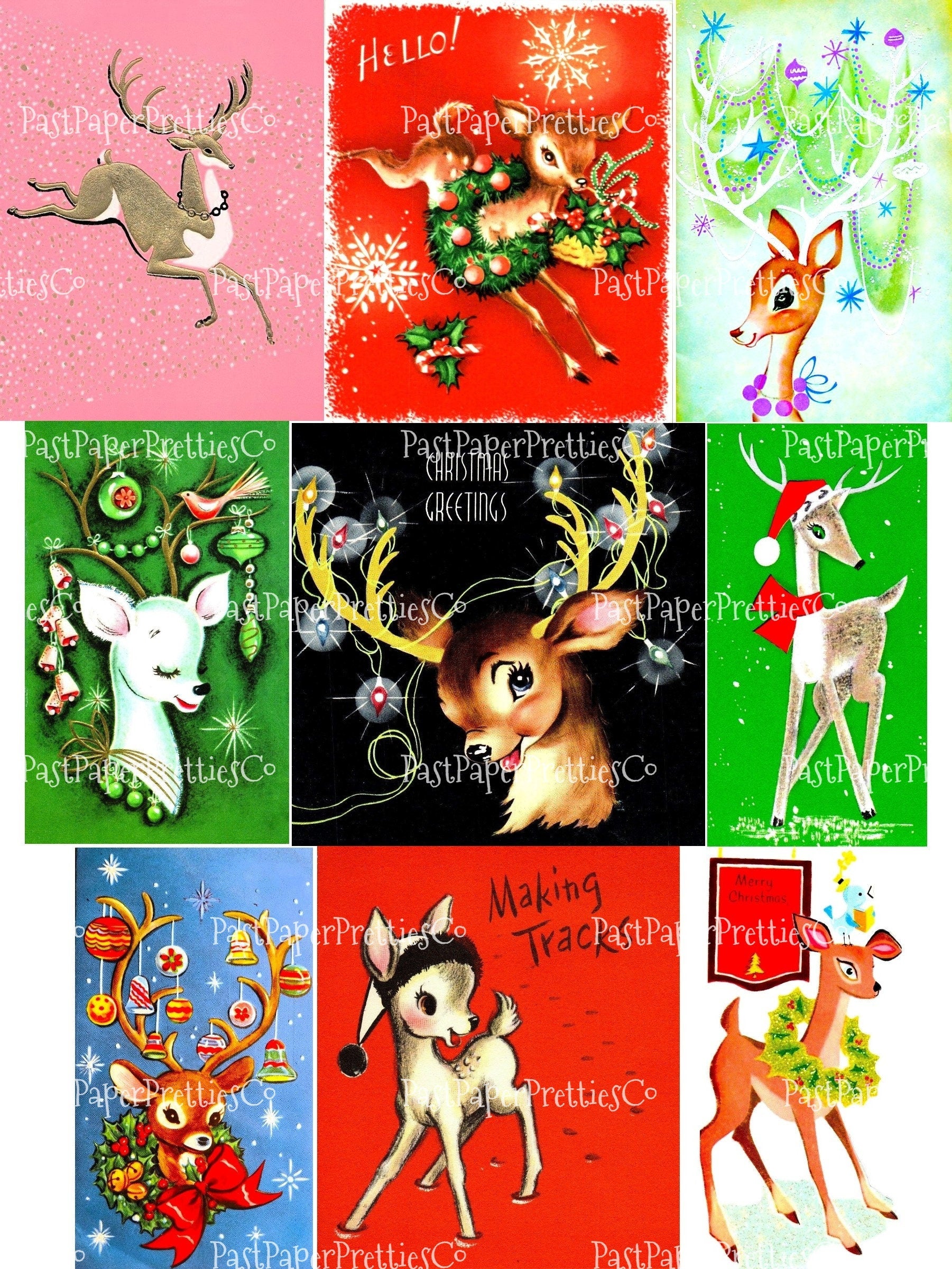 Vintage Printable Retro MCM Christmas Reindeer Collage Sheets and Full Card Images PDF Instant Digital Download Mid Mod Century Deer Clipart